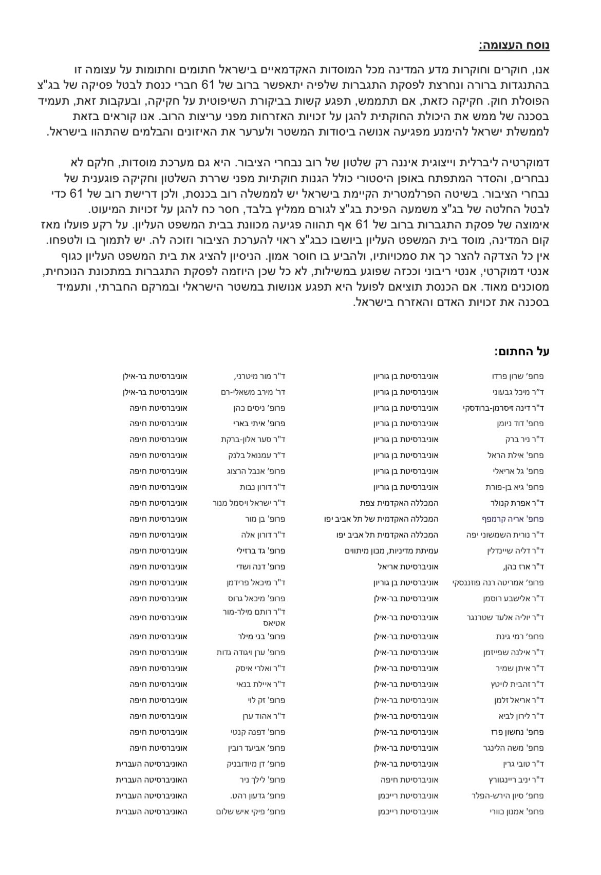 ההסכמים הקואליציוניים המתגבשים כוללים, כפי הנראה, חקיקה של פסקת התגברות ברוב של 61 חברי כנסת. פסקת התגברות כזו עוררה התנגדות, מוצדקת לטעמי, של רבים: בציבור הרחב ובייחוד בקרב המשפטנים ואנשי מדע המדינה. פסקת התגברות ברוב של 61 משמעה שהכנסת יכולה למעשה לבטל כל החלטה של בית המשפט העליון הפוסלת חוק בשל העובדה שהוא פוגע בצורה בלתי מידתית בזכויות מוגנות. שימוש נרחב בפסקת ההתגברות יאיין במידה רבה את ההגנה החוקתית על זכויות.